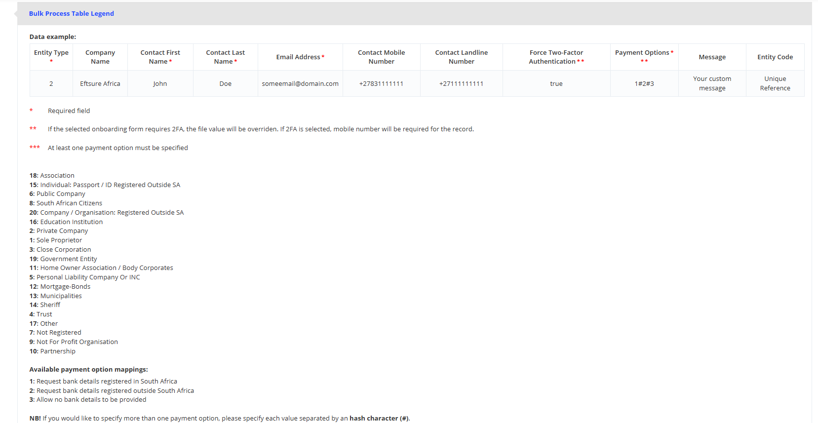- Enter the relevant payment option codes, such as "1" for South African bank details.