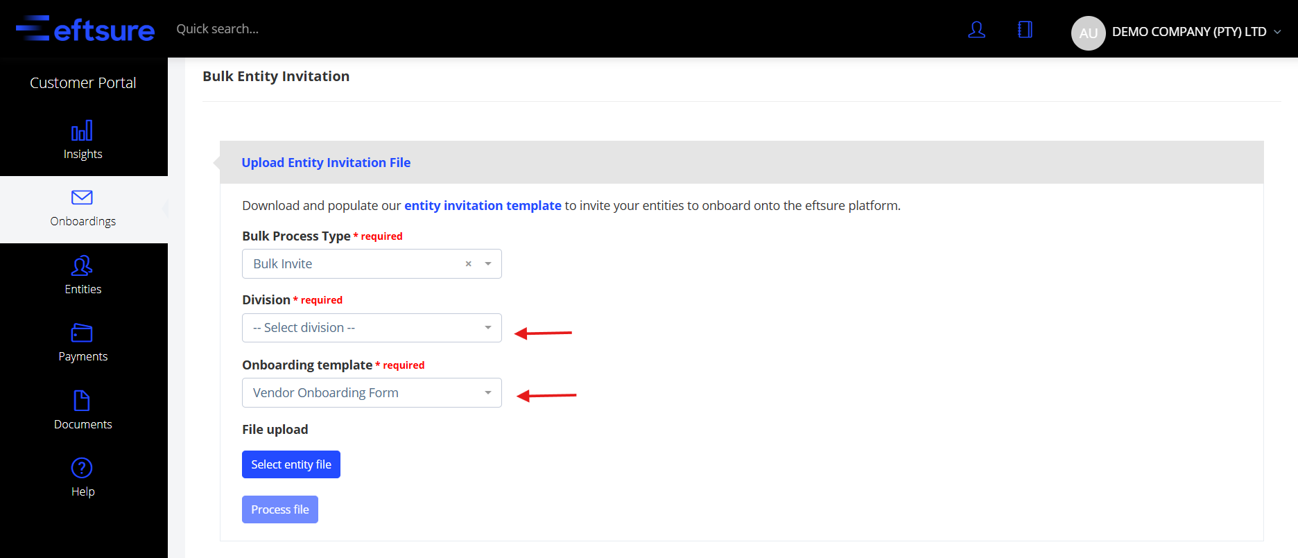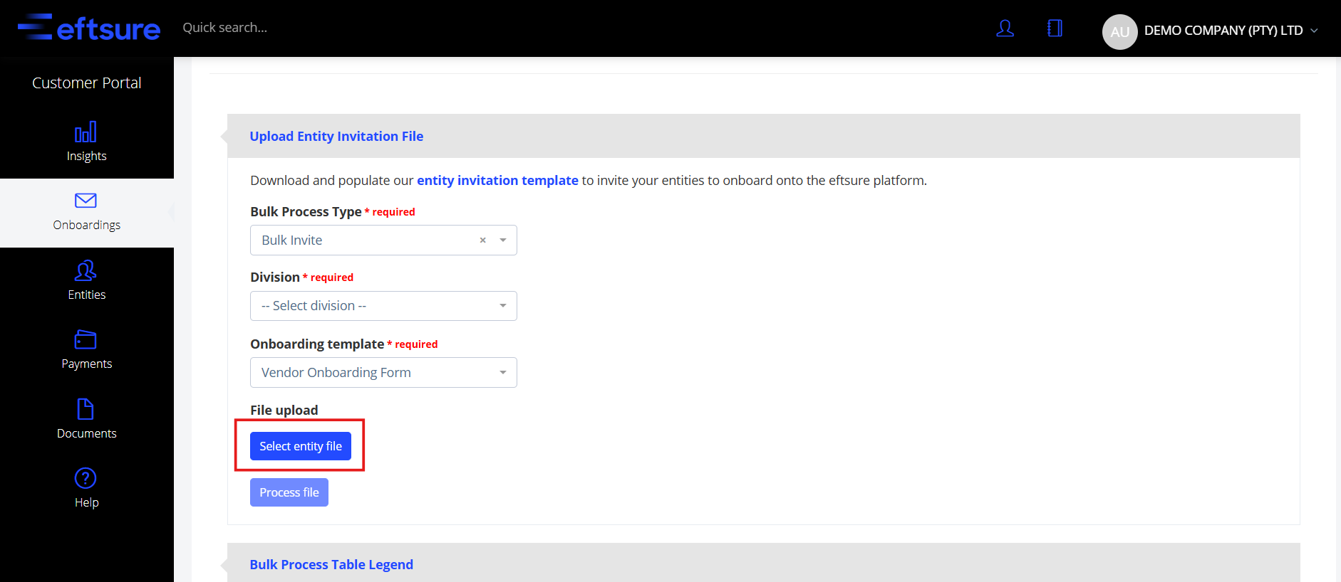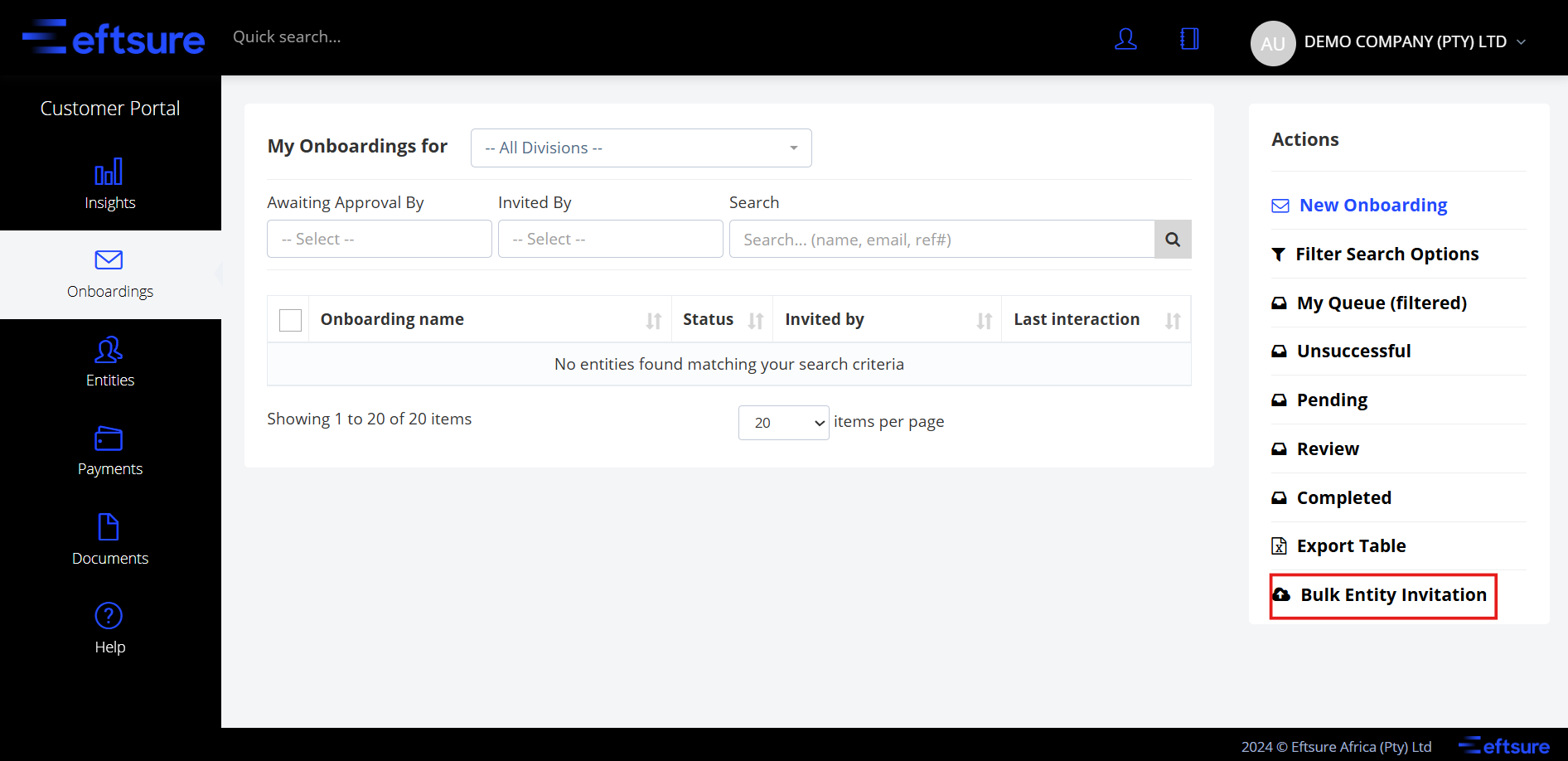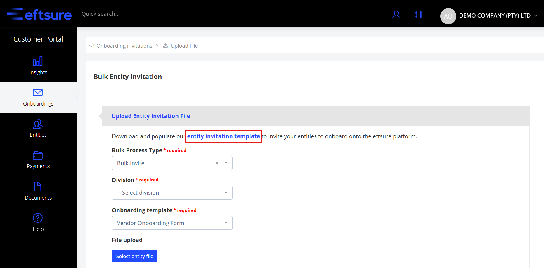 Inviting a New Entity to Onboard on the eftsure Portal To invite a new entity to onboard onto the eftsure portal, follow these steps: Navigate to the Onboardings Tab Click on the "New Onboarding" button. Fill Out the Onboarding Form A form will ...