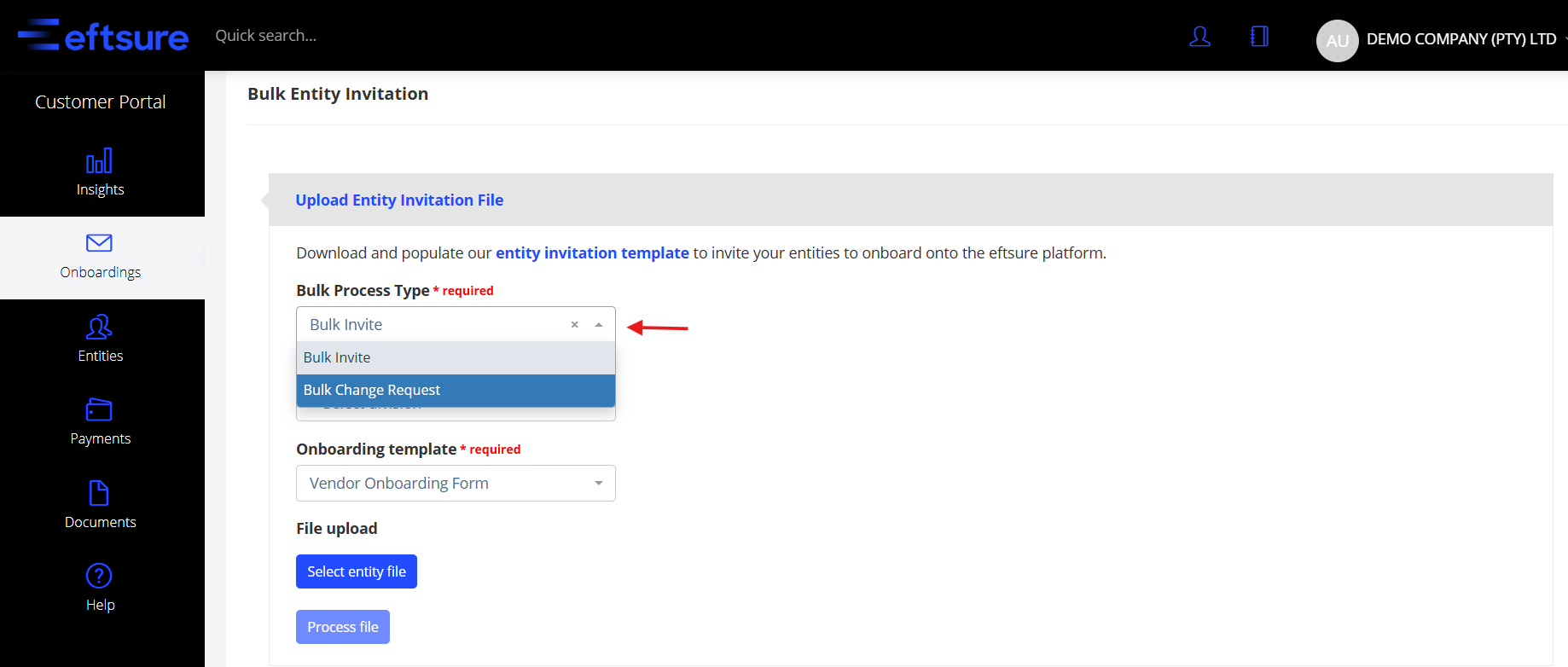 - Click "Bulk Process Type" and choose either "Bulk Invite" or "Bulk Change Request". If you select "Bulk Change Request", you can choose which sections you want the entities to update.