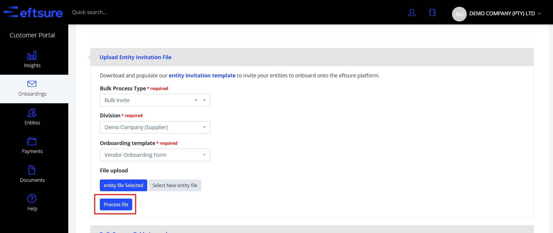 The Bulk Entity Invitation feature simplifies the onboarding process by enabling you to send invitations to multiple suppliers simultaneously. Follow these steps to efficiently send bulk entity invitations: